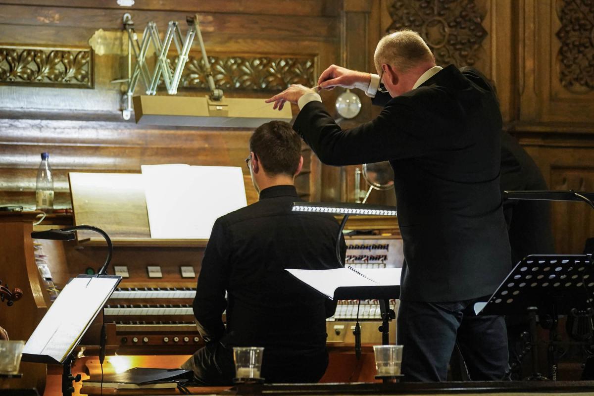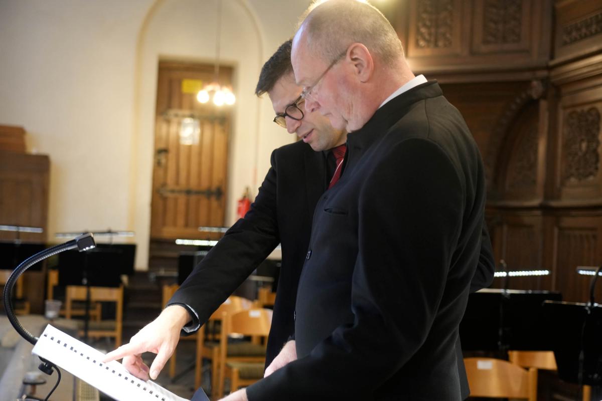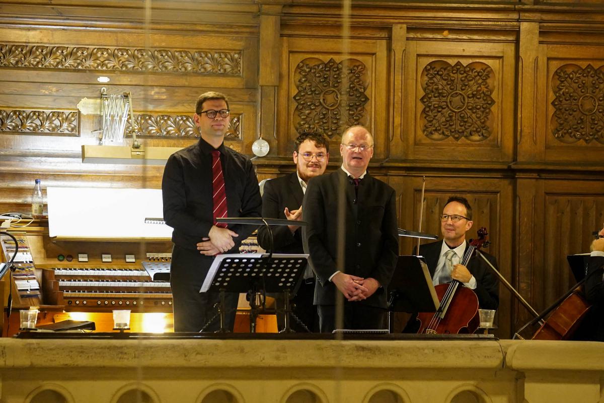 Die beiden Kantoren Martin Hesse (Gera) und Ralf Stiller (Greiz) hatten ein Chor-Orchester-Programm besonderer Vielfalt ausgewählt. Hauptwerk des Abends war das „Erste Konzert für Orgel und Orchester“ von Richard Bartmuß. Kantor Martin Hesse als Solist und die Vogtland-Philharmonie Greiz Reichenbach führten das Werk unter der Leitung von Kantor Ralf Stiller aus Greiz auf. Im Schlussteil krönte ein Chor das Werk. Durch Blasinstrumente und Pauke erhielt diese Komposition eine ganz besondere Festlichkeit, die mit sanften Wellen durch den Kirchenraum hallte. Auch die weiteren Werke des Abends, Psalm 150 des französischen Komponisten César Franck sowie das berühmte Streicher-Adagio von Samuel Barber und die sanfte Vertonung des „Verleih uns Frieden“ von Felix Mendelssohn-Bartholdy passten sich hervorragend in das Konzertprogramm ein. Die zahlreichen Besucher bedankten sich mit langanhaltendem Beifall bei den Musikern, den Chorleuten und den beiden Kantoren. (Fotos: Wolfgang Hesse)